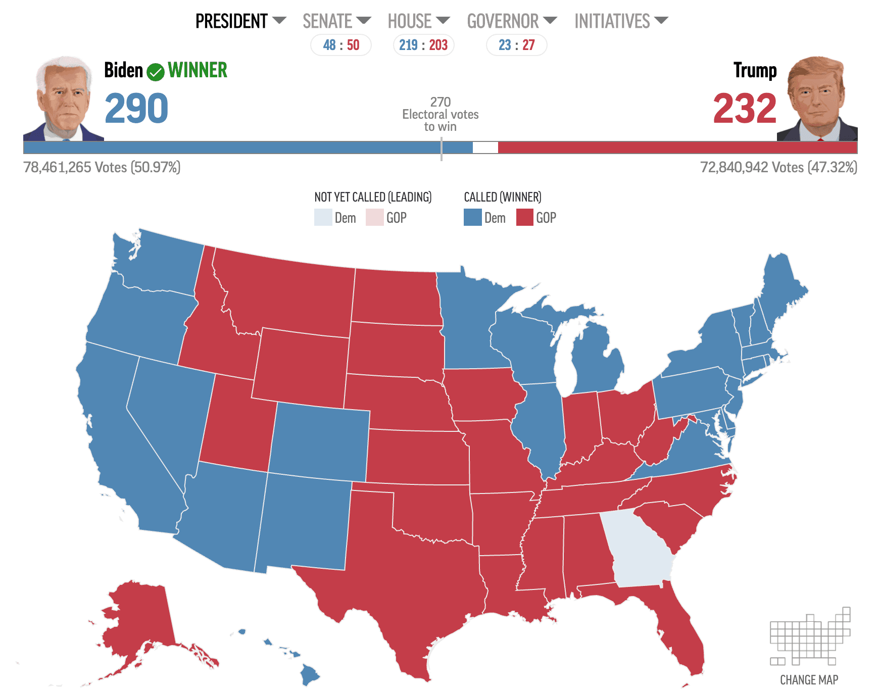 Hükümet sistemindeki prosedürel bağlamda ele aldığım çerçevenin pratikteki durumunda ise 3 Kasım seçim sonrasında, bazı eyalet ve seçim bölgelerinde oylar yeniden sayılmıştır. 20 Ocak 2021'e kadar olan süreçte iktidarın hangi koşullarda devredileceği ise yine daha belirgin hatlarla ortaya çıkacaktır çünkü henüz kesinleşmemiş güncel durumda her ne kadar Biden/Harris, seçimi başkan ve başkan yardımcısı olarak almış olsa da Demokratların Senato'daki durumu azınlıkta, Temsilciler Meclisi'nde ise çoğunluk durumundadır. Demokratların Senato'daki azınlık konumu, Biden ve Harris'in ılımlı Cumhuriyetçilerle çalışmak zorunda olmasını gerektirirken, ilerleyen süreçlerde parti üzerinden komisyonlara ve komitelere yönelim gerçekleşebilir. Senato'da ise Cumhuriyetçiler altı senelik bir periyotla da güvence altında bulunuyor.