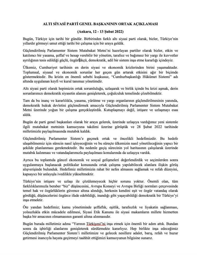 Açıklamada, "Güçlendirilmiş Parlamenter Sistem’i milletimize ve gelecek nesillere adalet, barış, refah ve huzur getirmesi inancıyla hayata geçirmeyi taahhüt ettiğimizi kamuoyunun bilgisine sunarız" denildi.