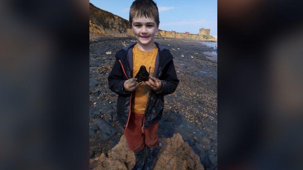 Sammy Shelton, resmi tatil tatilinde Suffolk'taki Bawdsey sahilinde 10 cm uzunluğunda (4 inç) dişi buldu.