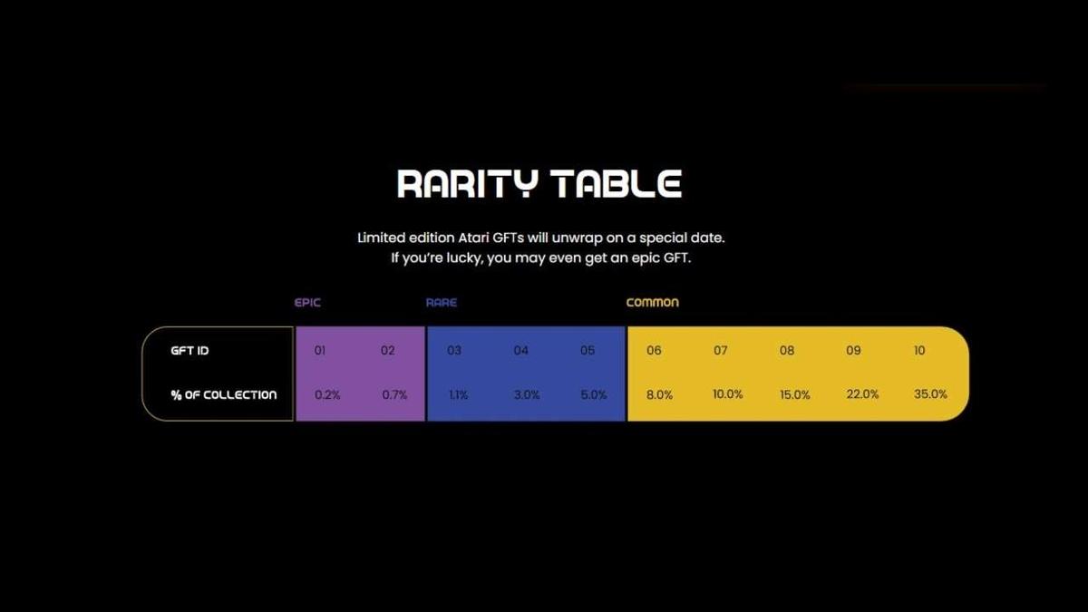 1972 yılında kurulmuş olan ve son zamanlarda adını pek duyamadığımız Atari, 50. yılının şerefine Lootbox ve NFT sistemlerini birleştirmiş. Şirket aynı oyunlarda kullanılan lootbox sistemine benzer şekilde NFT vereceğini bildirdi. Yani insanlara içinde ne olduğunu bilmedikleri kutuları satacak ve belli bir nadirlik değerine göre kutunun içerisinden NFT'ler çıkacak. Bununla beraber kullanıcıların bu NFT'leri aralarında takaslamasına da izin verilecekmiş. Bu kararın oyuncular tarafından iyi karşılanmadığını tahmin etmek zor değil çünkü bu yapılanın oyunlarla bir alakası yok. Kutuların içinden çıkabilecek eşyaların nadirlik değerlerini de aşağıda görebileceğiniz fotoğrafta belirtmişler.