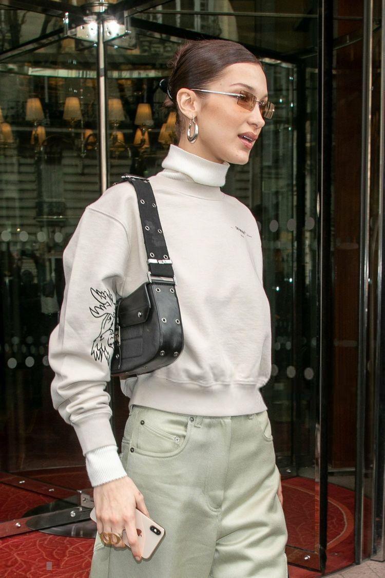 Bella, diz üzerinde biten deri ceketiyle aynı görünüme sahip bir baget çantayı tercih etmiş. Seksi, sert bir parça olan deri ceket ile birlikte açık renk bir jean giyerek kombinini daha spor bir hale getirmiş. Bahsettiğim jeane aksesuar takma olayını da yapmış.