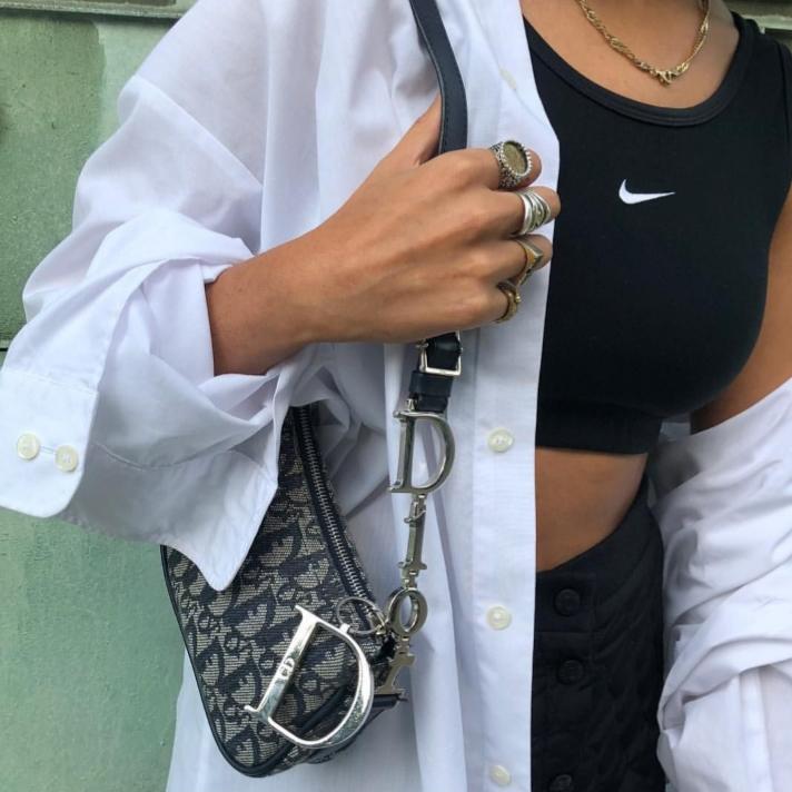 Dior marka bir baget çanta, siyah nike top, siyah jean ve oversize beyaz gömlek ile kullanımı. Her parmağa takılan yüzükler, boyunda tek bir zincir... Bu kullanımı, günlük kombinlerinize rahatça uygulayabilirsiniz. Son derece cool bir görünüm de elde etmiş olursunuz.