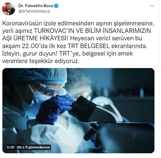 Bakan Koca yaptığı duyuruda "Koronavirüsün izole edilmesinden aşının şişelenmesine, yerli aşımız Turkovac’ın ve bilim insanlarımızın aşı üretme hikâyesi! Heyecan verici serüven bu akşam 22.00’da ilk kez TRT Belgesel ekranlarında. İzleyin, gurur duyun! TRT’ye, belgesel için emek verenlere teşekkür ediyoruz" ifadelerine yer verdi.