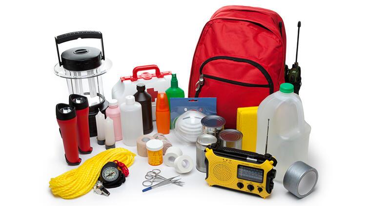 Çadır, battaniye veya uyku tulumu, kıyafet, su (kişi başına günlük bir litre olacak miktarda), ilaç, konserve yiyecek, çakmak, düdük, yağmurluk, ıslak mendil, çok amaçlı çakı, el feneri, pil, ilk yardım çantası, hijyenik ped, para (deprem sonrasında bankamatikler birkaç saat çalışmayabilir), ayakkabı, kağıt ve kalem. Deprem çantasının ulaşılabilir ve kapıya yakın bir yerde bulunması çok önemli. Son kullanma tarih olan maddelere 6 ayda bir kontrol etmek de oldukça önemli tabi.