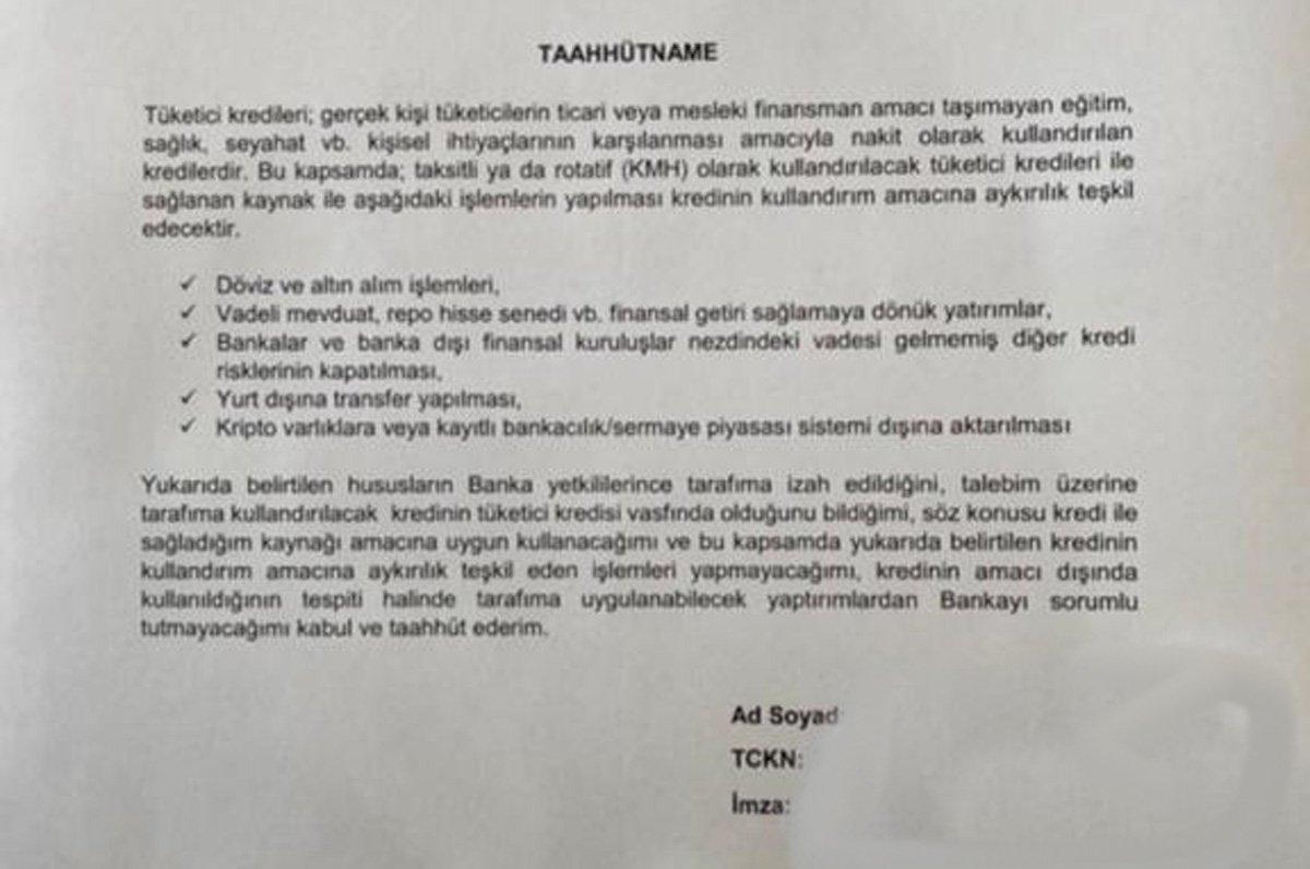 TL kredilerle döviz, kripto veya hisse alımını engellemeleri için BDDK’dan uyarı alan bankalar, çareyi müşteriye taahhütname imzalatmakta buldu.