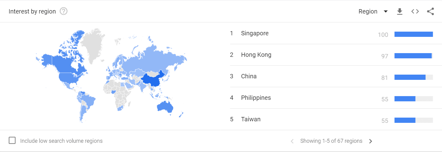Bu fotoğrafta da dünya çapında arama oranlarının renklerin koyuluğuna bağlı olarak değişimini gözlemleyebilirsiniz. Amerika'nın renk tonunun 48'e denk geldiğini göz ününde bulundurarak da başka ülkelerle karşılaştırmanızı yapabilirsiniz. Tabi eğer daha detaylı bakmak istiyorum derseniz Google Trends üzerinden hızlıca kontrol de edebilirsiniz.