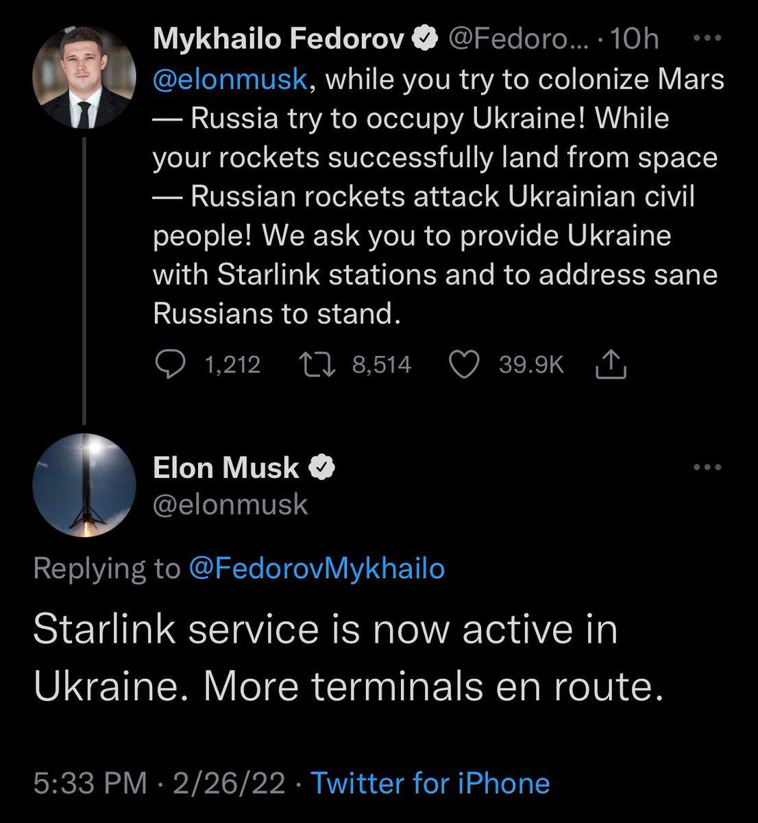 26 Şubat gününde Ukrayna'nın Dijital Transformasyon bakanı tarafından Elon Musk'a bir tweet atıldı. Bu tweet kendisinden Ukrayna halkına yardımcı olmasını istiyordu.