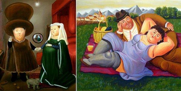 Fernando Botero’nun eserleri arasında kendi özgün tarzıyla ünlü sanat eserlerini yorumladığı resimler de bulunuyor. Leonardo da Vinci’nin Mona Lisa’sı ve Jan Van Eyck’ın Arnolfini’nin Evlenmesi bu eserlerden sadece birkaçı.