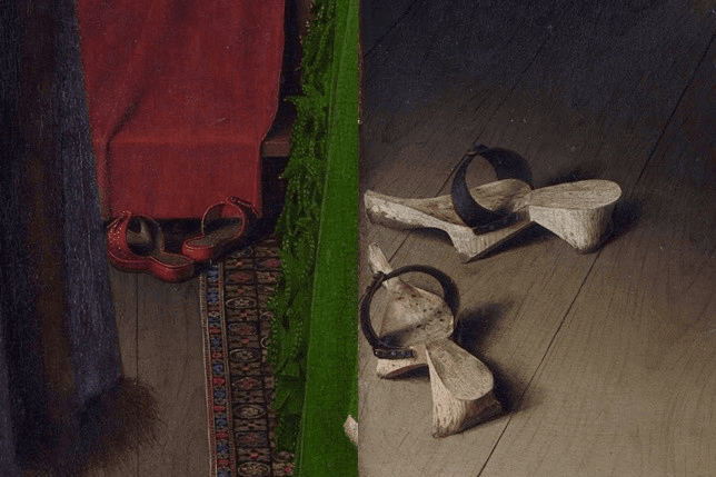 Portrede iki çift terlik görülmektedir. Bunlardan biri arnolfini'nin hemen önünde duran ve içe dönük olan tahta takunyalar, diğerleri de giovanna'nın arkasındaki divanın önünde duran saten terliklerdir. Bu görüşler eski ahit’e dayanıyor.