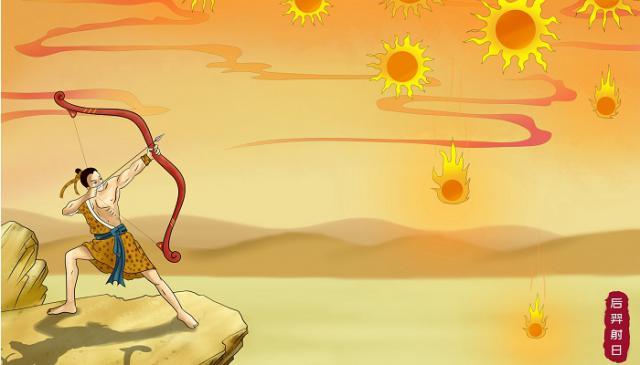 Efsaneye göre bundan çok uzun zaman önce gökyüzünde on tane güneş varmış. Bu güneşler sırayla doğar ve batarmış. Fakat sonraları güneşler sırayla görevlerini yapmayı reddetmiş, hepsi aynı anda gökyüzünde belirmiş. Tüm göller, nehirler kurumuş, bitkiler çürümüş, hayvanlar açlıktan ölmüş, insanlar yiyecek yemek bulamaz hale gelmiş. Günlerden bir gün Hou Yi adında genç bir okçu güneşler ile anlaşma yapmak istemiş, fakat güneşler bunu kabul etmemiş. Hou Yi 9 güneşi de okuyla vurduktan sonra geriye kalan son bir güneşi bırakmaya karar vermiş.