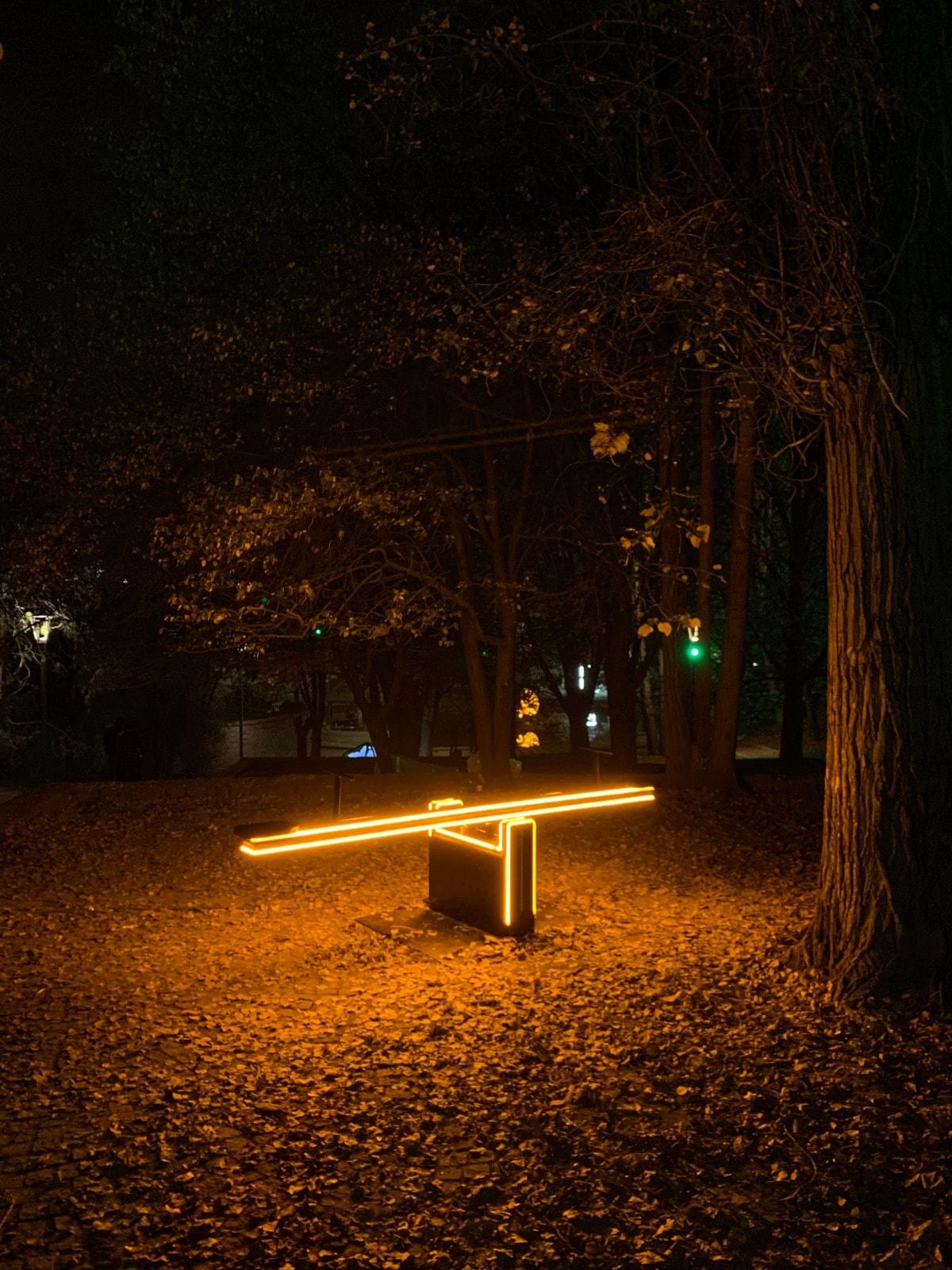 En beğendiğim eserler arasında ise hepimizin yakinen bildiği tahterevalli yer alıyor. Esra Koruç bu eserinde bizlere metaforik bir oyun hazırlamış. Şiddetsiz ve eşit bir dünya ancak çift taraflı çaba sonucu elde edilebilir. Toplumda kadın-erkek eşitliği istiyorsak, bu sadece kadınların çabası ile elde edilecek bir şey değildir. Her iki taraftan da eşit güç gelmek zorundadır. Bu oyunda da denge sağlandığında eşitliğin rengi olan turuncu yanmaktadır. Bir taraf diğerinden ağır bastığında ise kırmızı renk yanıyor.