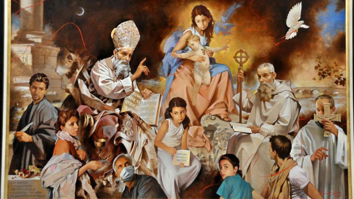 Aziz Sabinus ile Benedict'in karşılaşmasını konu alan tablonun değeri 17 bin euro. Tabi din konulu bir eserde böyle bir şeyin olması kabul edilemeyeceğinden kaldırılmış. Ancak kaldırılmış olsa da çoktan internette yayıldı ve insanlar kendi yüzlerini de bu resmin içine koymaya başladı. Resmi çizen sanatçı, Giuseppe Antonio Lomuscio, toplumdan iki yönetici figürü eserine katmayı istediği için bu iki beyefendiyi resmin içine eklediğini belirtmiş. Sonuç olarak da bizlerin komik bulacağı bir tablo ortaya çıkmış.