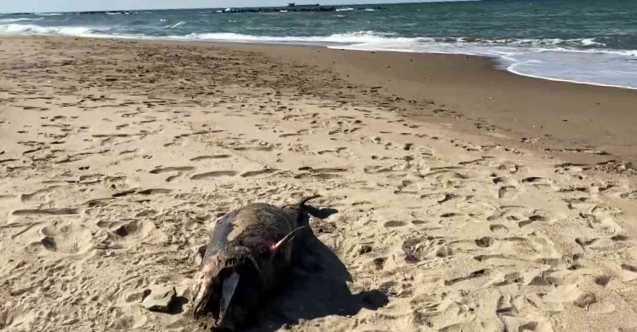 Sakarya'nın Karasu ilçesinde sahile ölü bir yunus balığının vurduğunu fark eden vatandaşlar ölü yunus balığını cep telefonu ile kayıt altına aldı.