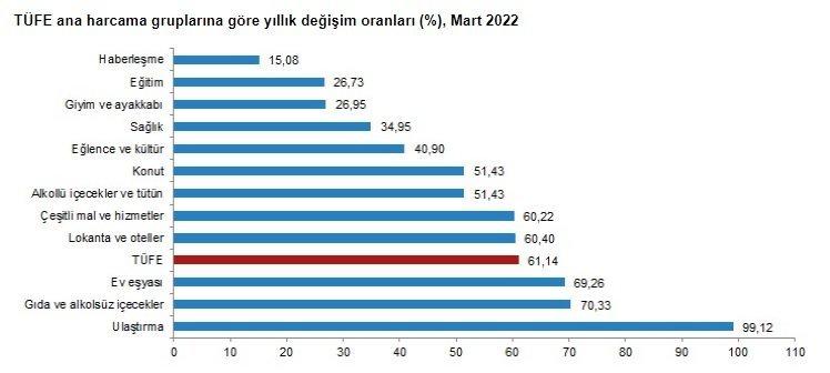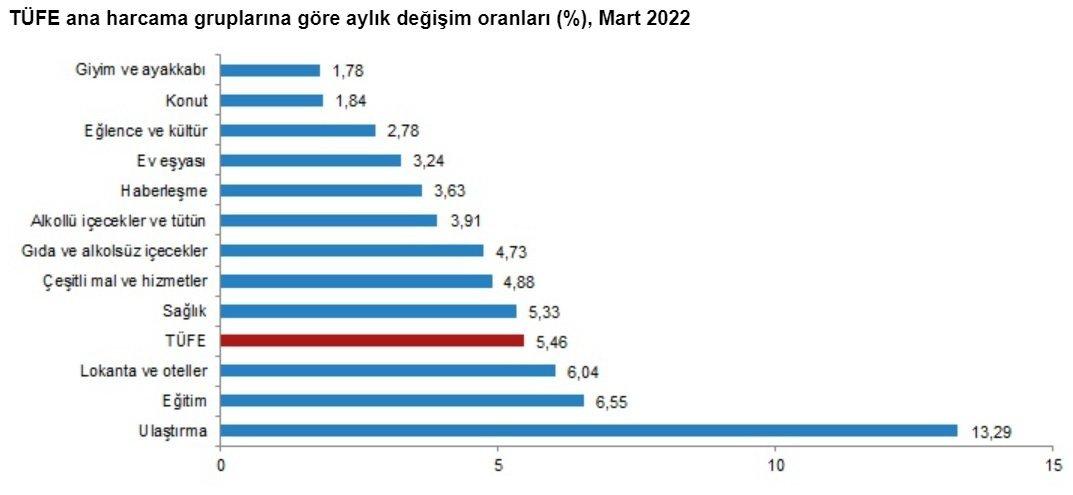 Buna karşılık, 2022 yılı Mart ayında artışın yüksek olduğu ana gruplar ise sırasıyla, yüzde 13,29 ile ulaştırma, yüzde 6,55 ile eğitim, yüzde 6,04 ile lokanta ve oteller oldu.