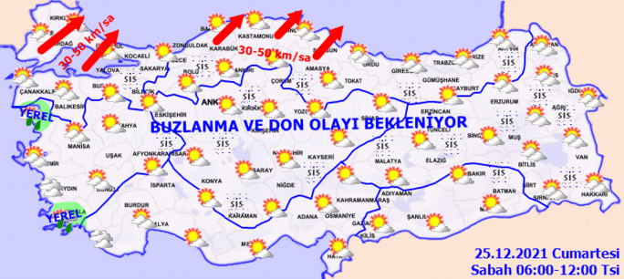 Meteoroloji Genel Müdürlüğü tarafından yapılan son değerlendirmelere göre ülkemizin kuzey ve batı kesimlerinin parçalı yer yer çok bulutlu, Kıyı Ege ve Çanakkale çevreleri ile Balıkesir'in batı kıyılarının yağmur ve sağanak yağışlı, diğer yerlerin parçalı ve az bulutlu geçeceği tahmin ediliyor. İç ve doğu kesimlerde buzlanma ve don ile birlikte yer yer pus ve sis bekleniyor.
