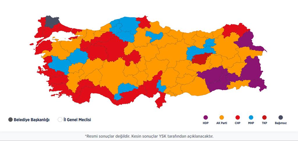 Sonuçlar harita üzerinde incelenecek olursa seçimin ivme gösteren iki partisi CHP ve MHP oluyor. 2014 seçimlerinde AKP 18’i Büyükşehir 48, CHP 6’sı Büyükşehir olmak üzere 14, MHP 3’ü Büyükşehir olmak üzere 8 ve BDP 3’ü Büyükşehir olmak üzere 10 il belediye başkanlığı kazanmıştı. 31 Mart seçimlerinde ise AKP 15’i Büyükşehir 39, CHP 11’i Büyükşehir 21, MHP 1’i Büyükşehir 10, HDP 3’ü Büyükşehir 10 belediye başkanlığı kazandı. Cumhur İttifakında, ittifakın bir unsuru şehir kaybederken öbürü kazanmış, bu ittifaktan fayda sağlamış gözüküyor. AKP’nin, MHP’nin kazandığı ilçeye itiraz etmesi bu duruma kızmış olduğunu gösterir mi? Öte yandan Millet İttifakı’nın seçim sonuçlarından memnun olduğu anlaşılıyor. Parti genel başkanlarının seçim sürecinde birlikte düzenledikleri mitingler de göz önüne alınca millet ittifakının daha uyumlu bir tutum sergilediği söylenebilir mi?