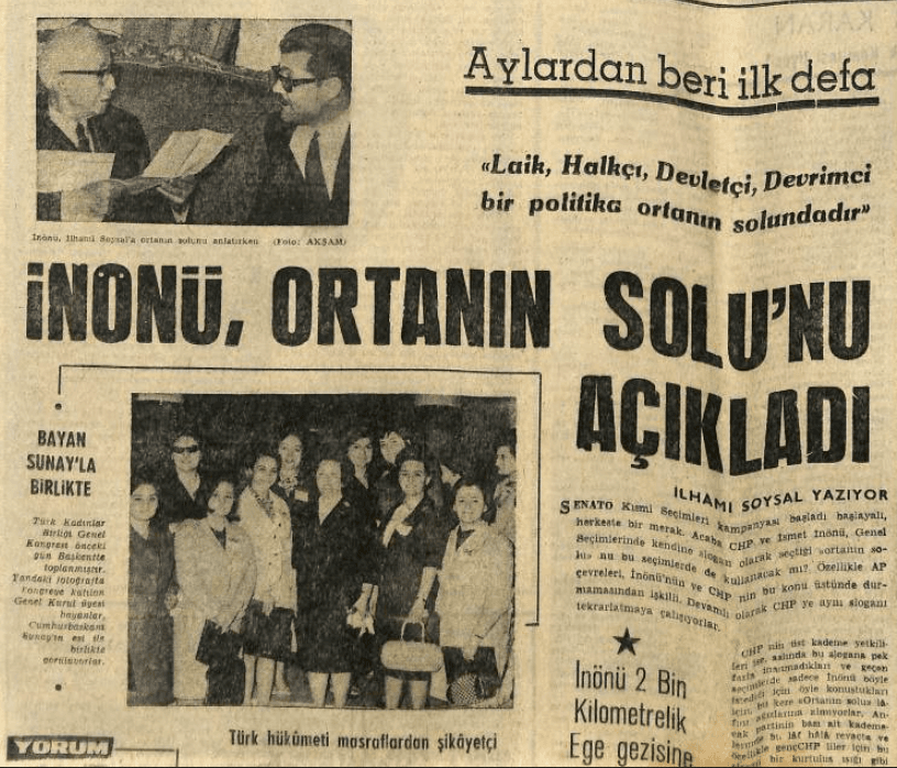 Türkiye’de partilerin siyasi yelpazede hangi noktada da bulunduğu, sağda mı, solda mı olduğu gibi konular hem siyasiler hem de toplumun bütününde yıllardır çokça tartışılan konulardan biri olmuştur. İdeolojik olarak merkez sağ denilebilecek bir partiye rakip parti taraftarları sol da diyebiliyor, aşırı sağ da diyebiliyor. Aslında Türkiye siyasi tarihine bakarsanız bir noktaya kadar siyasi tartışmalar doğrudan sağ-sol üzerinden değil vaatler ve politikalar üzerinden yapılıyordu. İlk kez Cumhuriyet Halk Partisi 1965 genel seçimlerinde CHP'nin ortanın solunda olduğunu belirtti ve belki de hiç sonlanmayacak bir tartışmanın fitili ateşlendi. Özellikle Adalet Partisi’nin antikomünist politikalar yürüttüğü bu yıllarda halka iletilecek bilginin çok rahat dezenformasyona uğrayabileceği bir ortamda “solda” olduğunu söylemek çok farklı tartışmalara yol açabilirdi. Bu çıkış sağ partiler için iyi bir koz olmuştu. Onlara göre CHP zaten mensubu olduğu solu itiraf etmişti ve bu sağ partiler için halka CHP’yi komünist, Moskof ve belli farklı sıfatlarla tanıtma imkânı doğurmuştu. Özellikle Adalet Partili’ler ve diğer sağ parti destekçileri “Ortanın solu, Moskova yolu”, “Ortanın solu, solun ortası” gibi halkın aklında rahat kalabilecek sloganlarla halkın CHP'ye karşı bakışını değiştirmeye çalışıyorlardı. CHP’de düşen oy oranları ve başarısız koalisyon denemeleri sonrası oylarını arttırmak, halkta güvenini tekrar kazanmak ve dönemin yeni sol partisi Türkiye İşçi Parti’sinden kendini ayırıp seçmenlerini korumak adına dönemin genel başkanı İsmet İnönü tarafından ortaya atılan bu ortanın solu kavramı ilk vadede bekledikleri faydayı sağlayamadı, tam tersine problem yarattı. CHP bundan sonra halka ortanın solunun komünizm olmadığını, bir aşırılık olmadığını anlatmak durumundaydı ve seçim boyu bunu yaptılar.