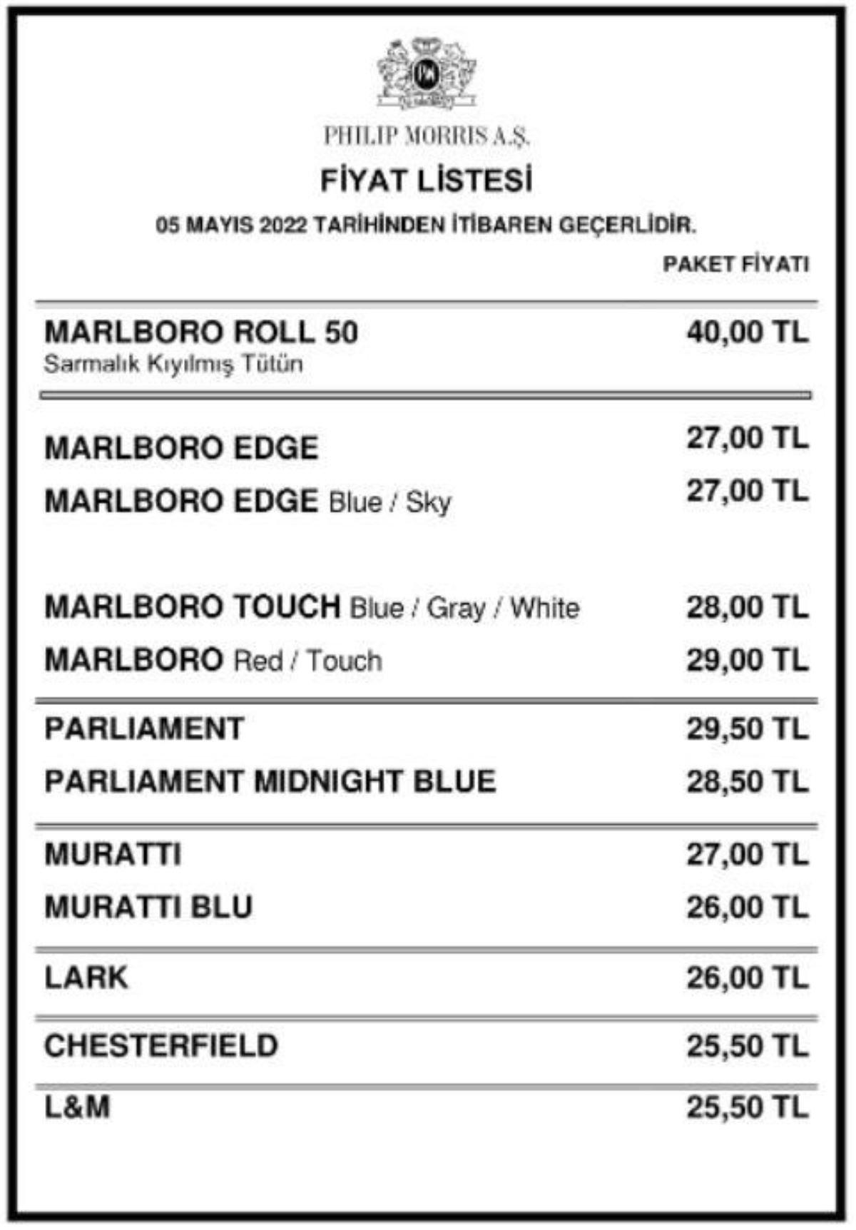 Philip Morris sigara grubunun fiyatlarına 2 TL zam geldi.