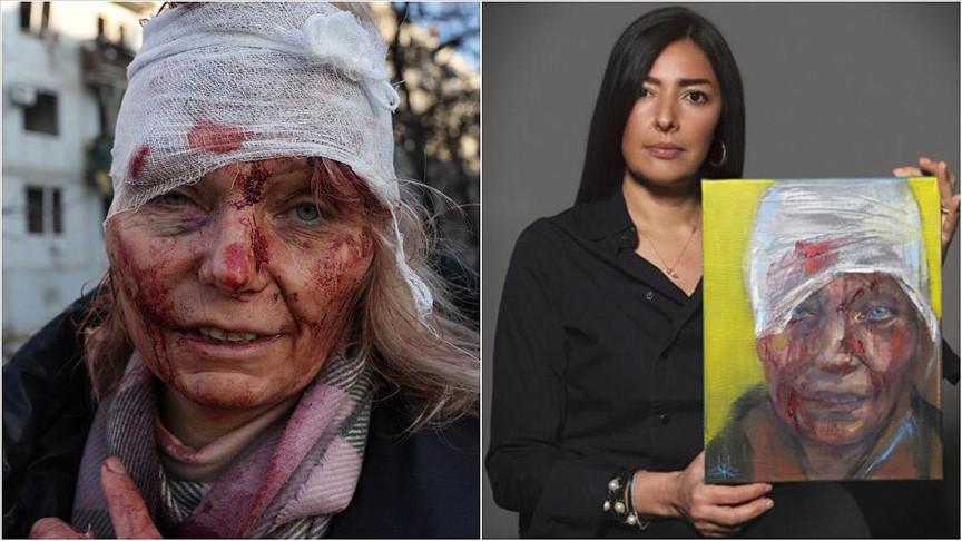 AA foto muhabiri Wolfgang Schwan'ın Rusya'nın Ukrayna'ya saldırısı sırasında 25 Şubat'ta çektiği, başı sargılı ve yüzü yaralı Olena Kurilo'nun fotoğrafını, Heritage Auctions'taki açıklamaya göre ressam Zhenya Gershman yağlı boya tablosu yaptı.