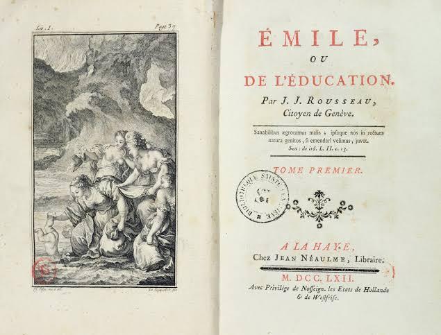 Rousseau' nun "Emile" kitabı ve Rousseau' nun eğitim felsefesi hakkında bir makale.