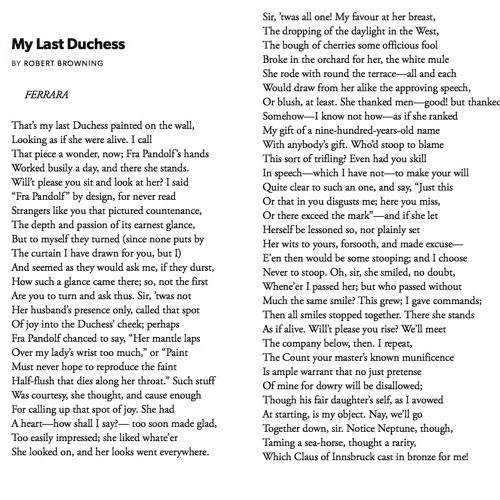We feel the drama going over the poem. One of the themes of the poem is violence. Even though we don’t read full of violence, we still understand the murder. The other theme is jealousy because he killed his last duchess due to his extreme jealousy of his last duchess. The structure of the poem is like the poet writes about a fictional story full of ironies. The poem is very powerful and strong. The language is very simple and understandable. When I understand that Duke killed his last Duchess. It makes me a bit shocked because I wasn’t expecting that. He is talking about his last duchess well but later when he talks about his next duchess, we understand he sees his duchess as an object immediately. But still, it is a very powerful poem.