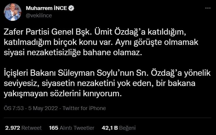 İnce sosyal medya hesabından, “Zafer Partisi Genel Bşk. Ümit Özdağ’a katıldığım, katılmadığım birçok konu var. Aynı görüşte olmamak siyasi nezaketsizliğe bahane olamaz. İçişleri Bakanı Süleyman Soylu’nun sayın Özdağ’a yönelik seviyesiz, siyasetin nezaketini yok eden, bir bakana yakışmayan sözlerini kınıyorum” dedi.