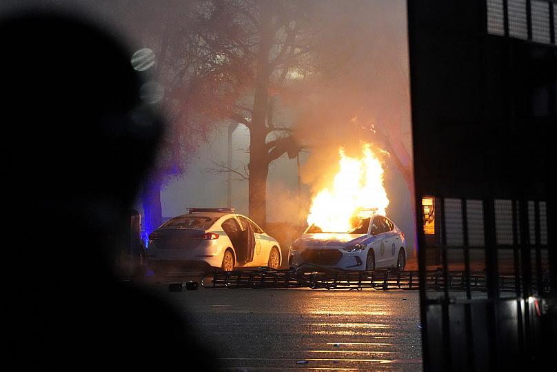 Almatı'da onlarca polis ve askeri araç ateşe verildi.