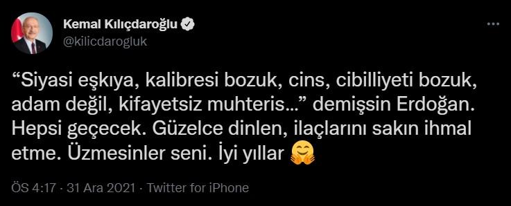 CHP Genel Başkanı Kemal Kılıçdaroğlu, Cumhurbaşkanı Recep Tayyip Erdoğan'ın kendisi hakkındaki "Siyasi eşkıya, kalibresi bozuk, cins, cibilliyeti bozuk, adam değil, kifayetsiz muhteris" sözlerine yanıt verirken, "Hepsi geçecek. Güzelce dinlen, ilaçlarını sakın ihmal etme. Üzmesinler seni. İyi yıllar" dedi.