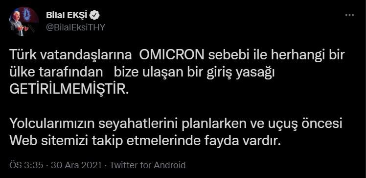 Ekşi, "Türk vatandaşlarına OMICRON sebebi ile herhangi bir ülke tarafından bize ulaşan bir giriş yasağı getirilmemiştir. Yolcularımızın seyahatlerini planlarken ve uçuş öncesi web sitemizi takip etmelerinde fayda vardır" dedi.