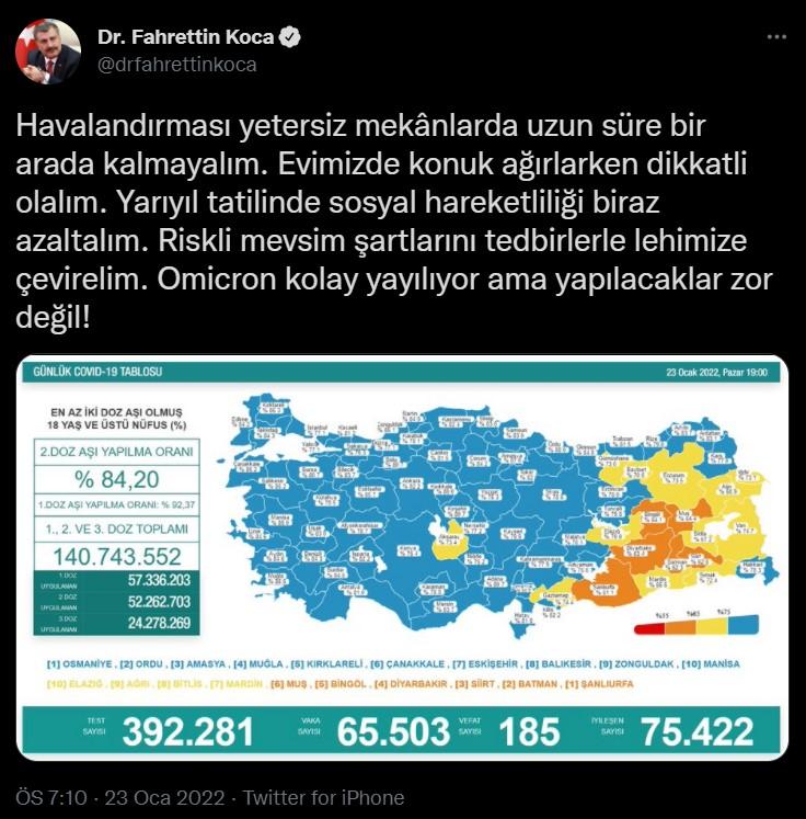 Son 24 saatte 392 bin 281 Kovid-19 testi yapıldı, 65 bin 503 kişinin testi pozitif çıktı, 185 kişi yaşamını yitirdi.