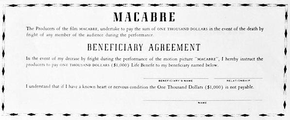Castle filmlerine daha fazla seyirci çekmek için farklı reklam denemeleri yapmaya başlaması Macabre ile başlamış. Küçük bir Amerikan kasabasında geçen klasik bir korku/gerilim türünde olan film için Castle, bir sigorta şirketi ile anlaşma yapmış. Filmin bilet satış noktasında seyircilere bilet ile beraber aynı zamanda Lloyd's of London adlı sigorta şirketinden bin dolarlık hayat sigortası verilmiş. Bunun nedeni ise eğer film sırasında korkudan biri ölürse bu hayat sigortasından faydalansın diye. Castle filminin ne kadar korkunç olduğunu daha film başlamadan seyirciye hissettirmiş.