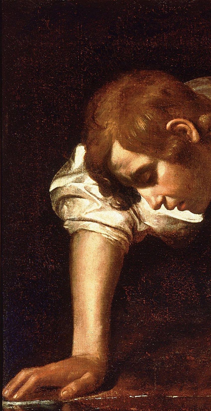 Tek eliyle destek alarak sudaki yansımaya bakan bu açık kahverengi başlı genç çocuk, Barok Dönemi 17 – 20 yaş erkek figürlerinin ideal görüntüsüdür.