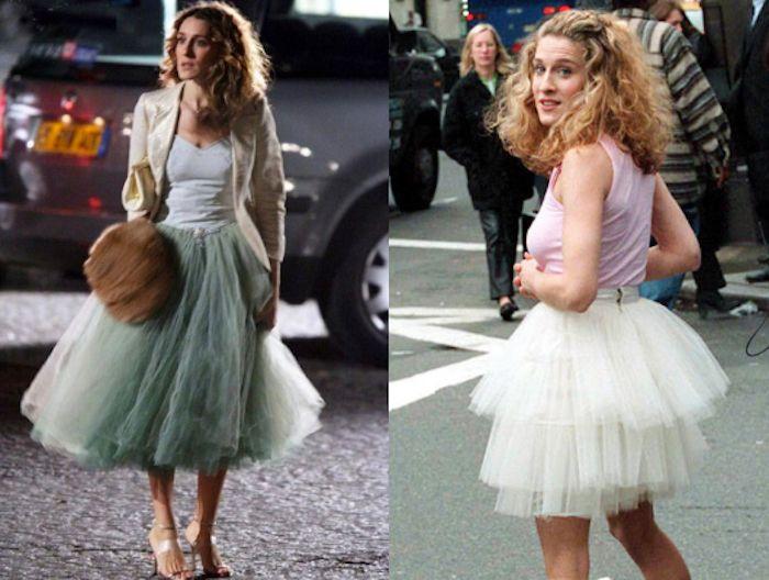 Carrie Bradshaw’ın en ikonik giyimleri arasında yer alan tüylü, volanlı tütü etekler, sadece bir kıyafet parçası değil, aynı zamanda dizinin kadınsı, romantik havasını simgeleyen bir ikon haline geldi. Carrie'nin tütü eteğiyle New York sokaklarında yürüdüğü sahne, dizinin başından itibaren hafızalara kazındı. Tütü etekler, genellikle pastel tonlarda ve abartılı hacimlerde tasarlanmıştı. Bu parça, kadına zarif bir feminenlik katarken aynı zamanda özgür ve cesur bir ifade biçimi sunuyordu. Tütü etekler, geleneksel şıklığı modern ve şık bir şekilde yeniden yorumlayan bir parça olarak, kadınlar arasında eğlenceli ve genç bir görünüm arayışını tetikledi. Ayrıca, tütü eteklerin topuklu ayakkabılarla kombinlenmesi, şıklığın ve rahatlığın bir arada olabileceğini gösterdi.