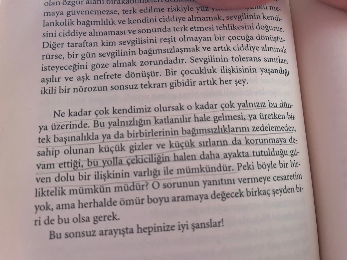 Söylüyorsa da, bunun bilimsel olmadığını illa belirtiyor. Doğru ya bizim hayat şartlarımızı, isteklerimizi, kimliğimizi ele alarak karar vermemizi istiyor bizden, belki de tıpkı danışanlarına yaptığı gibi. Bilimsellikteki bu yalınlığı ve tek bir doğru olmadığını hissettiren duyguyu seviyorum, kendi düşüncelerini sorgulanmaz bir fact gibi sunanların aksine. Tarihte bu konu hakkında yazılmış önemli kaynaklarda konuyla bağlantılı şöyle şöyle yazılar yazılmış; X kişisi bunu demiş ama Y kişisinin antitezi bunu böyle ele alıyor ve buna şu açılardan karşı çıkıyor, peki bu konu hakkındaki tavrımız nasıl olmalı gibi ilerlemiş ve ihtiyaçlarımıza, benliğimize göre cevaplar da verebileceğimizi, o şekilde davranabileceğimizi ve bunun da normal olabileceğini, istisnaları da yer yer kucaklayarak çok bütüncül ve akıcı bir eser ortaya koymuş. Eğer psikolojiye, psikanalize aşk, göç, can sıkıntısı gibi tamamen insani duygu ve durumlarla bağdaştırılmış ve çok farklı bilgilerle karşılaşacağınız ya da bazı satırlarda yer yer kendinizi daha iyi anlayacağınız, veyahut bazı anlamlandıramadığınız, ifade edemediğiniz duygu ve düşünceleri farkındalıkla şaşırarak anlayacağınız bir şeyler tüketmek isterseniz kesinlikle önereceğim bir kitaptır özetle. Şimdiden iyi okumalar dilerim :)