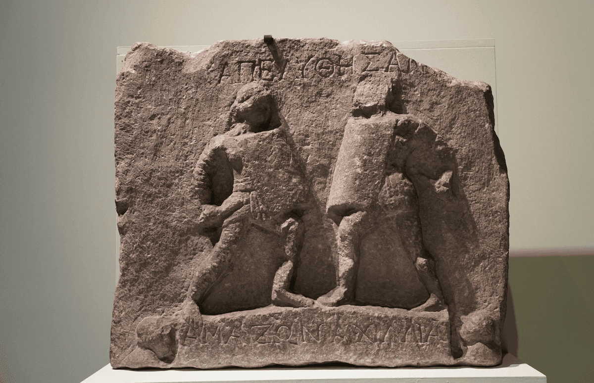 Bugün British Museum'da yer alan mermer bir kabartma, kadın gladyatörlerin mevcudiyetini gözler önüne seren ilgi çekici bir eser. Halikarnassos Antik Kenti'ndeki kazılarda bulunan ve MS 1. veya 2. yüzyıla tarihlenen kabartmada, Amazon ve Achillia isimlerinde iki kadın gladyatör tasviri görülüyor. İsimlerini mitolojiden alan bu gladyatörler kılıç ve kalkanla kuşanmış halde ve saldırı pozisyonunda tasvir edilmiş. Kabartmanın alt köşelerine ise izleyicileri temsilen iki kafanın yerleştirilmiş olduğu görülür.
