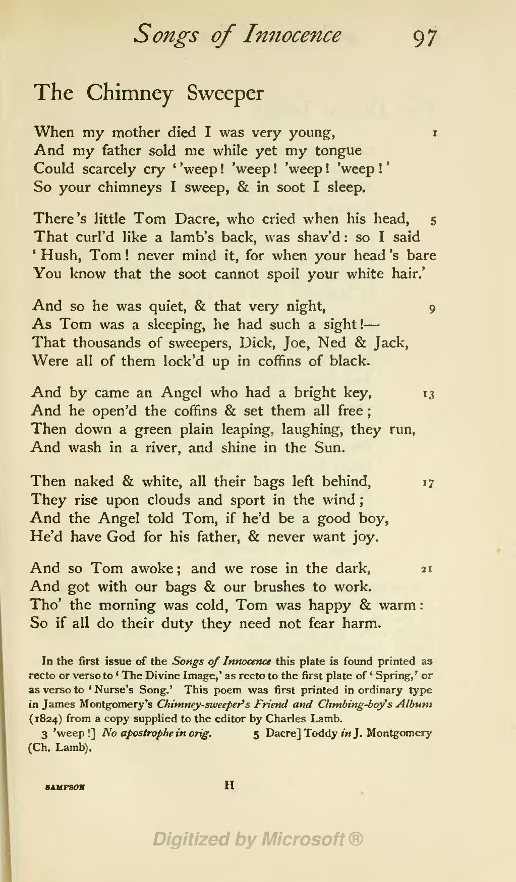 Blake bu şiirde “umut, masumiyet ve ölüm” temalarını kullanarak 18. yüzyıldaki ve ondan önceki dönemlerde yaşanan çocuk işçiliğine ve onların baca temizleyicisi olarak çalıştırılmasına dikkat çeker. Bu temaları yansıtmak amacıyla “kuzu, kara tabut ve çayır” gibi semboller kullanır.