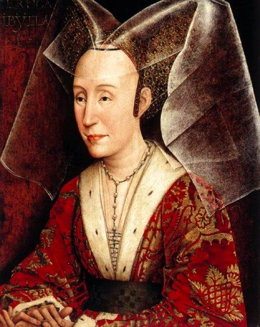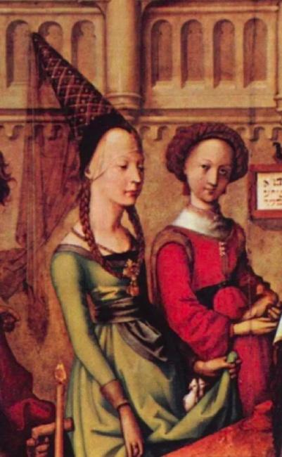 Çağı tanımlayan aksesuarlardan bir diğeri, kafanın arkasına eğik olarak takılan konik şapkalar, hennin, idi.