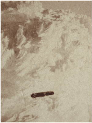 9- 1870'te New Hampshire’da gözlemlenen “esrarengiz hava gemisi” (mystery airship) olarak belirtilen UFO’nun fotoğrafı. Silindir ya da puro biçimli UFO’lar, ufologlarca, içinden uçan dairelerin çıktığı "ana gemi" olarak nitelendirilmektedir.