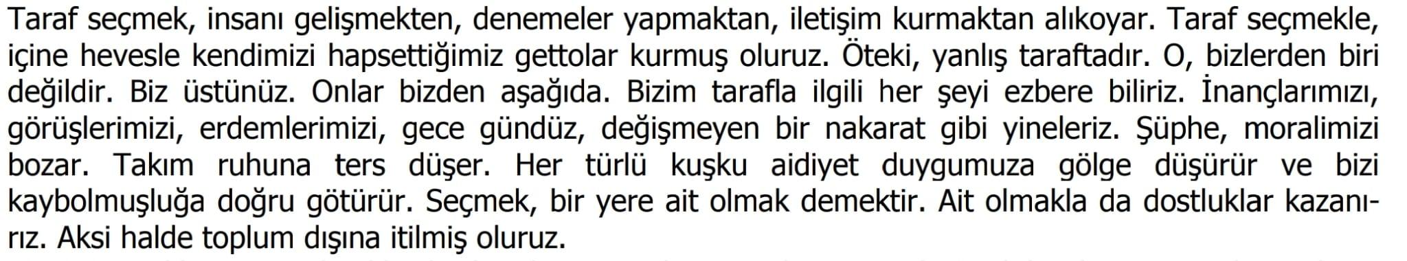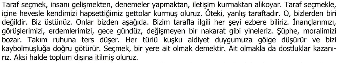 Son olarak zaman zaman benim de içine girdiğim o girdaptan söz edeceğim. Biri olumsuz konuştuğunda ya da sapına kadar savunduğum kendi gerçekliğime ters düşen bir görüş bildirdiğinde kimi zaman sözünü bitirmeden hemen müdahale etme arzusuyla yanıp tutuşma halinden müzdaribim. Son zamanlarda her ne kadar törpülemiş ve kendi safıma çekilmişsem de bu oldukça kötü duruyor bunu belirtmek isterim. Herkes aynı düşünmese daha iyi moduna geçtim. Çünkü bu durum pek eğlenceli değil. Düşünsenize hep kendinizle karşılaştığınızı! Korku filminden farksız olmazdı. Hem belki karşı tarafın öğretisinden almamız gereken bir şey olup olmadığını da bilmiyoruz. Son zamanlarda yeni bilgi alma açlığı çekiyorum bu sebeptendir ki dinleme modundayım oldukça yeni bilgi edinip burası çok önemli araştırma fırsatı buluyorum. Çok uzatmadan yazımı bitiriyor ve Vassaf'a kulak kesilmenizi rica ediyorum.