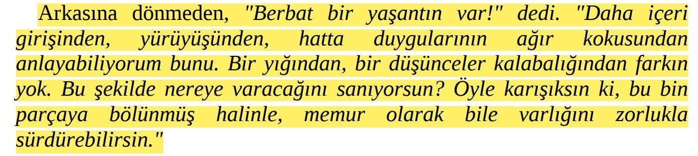 Bir süre sonra fark ettim ki bu 'yaşam telaşı' dediğimiz durum bizim uydurmamız. Açıkça konuşmamı isterseniz arkasına sığındığımız bir barikat. İş arkadaşlarımız hakkında iyi ya da kötü konuşur, bir şeylerin yolunda gitmediğinden dem vurur, işlerin nasıl da kötüye gittiğinden bahsederiz. Sizi bilmem ama bu yolu ezbere bilen birisi olarak söyleyebilirim ki bu çürüme hali işlerin kesinlikle ters gittiğinin hatta virajı dönemeyip köprüden aşağı sert bir şekilde düşmenize yol açacağının bir işaretidir.