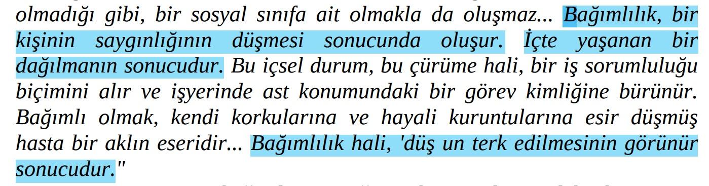 Hayatlarımızı berbat hale getiren uykuda olma halimiz ve mutluluğu dışarıda bulma arayışımızın bağımlılığıdır. Kimimiz gerçekte nasıl bireyler olduğumuzu görmemek için yoğun çalışma temposununun içine gireriz. Çünkü içimiz daha çok işin kaybolmayla eşit anlamlara geldiğini bilir.