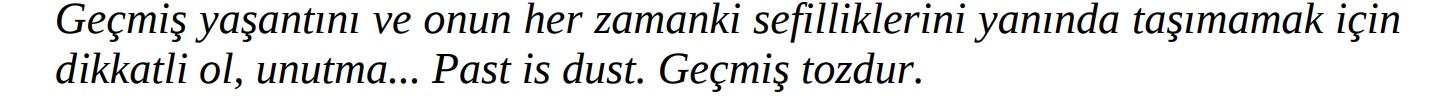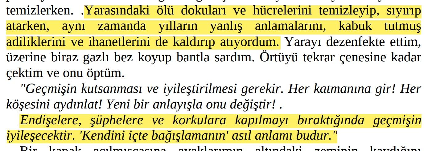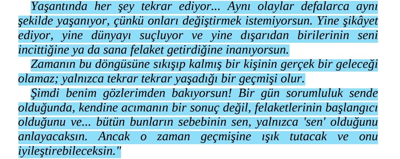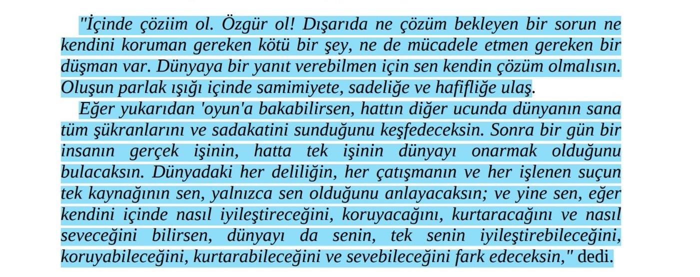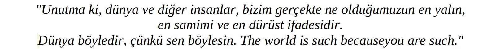 ''Dünya böyledir, çünkü sen böylesin.'' İçinde karmaşa hakimse dışında memnun olmayan ve sakinliğe hiç ulaşamayan sen varsın. İçinde güvenemiyorsan kendine etrafında ne yaparsan yap sana güvenemeyen insanlar bulacaksın. Nasıl bir dünya istiyorsan onu düşle, istediklerinle yaptıkların çelişiyorsa değiştir kendini ve geçmişini affet.
