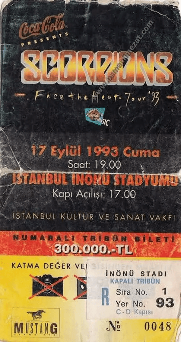 23-25 Mayıs tarihlerinde art arda iki gün Küçükçiftlik Park'ta konser vermek üzere Türkiye'ye gelen Scorpions, ben dahil olmak üzere Türk dinleyicilerini tarif edilemez bir sevince boğdu. Grup, Türkiye'de ilk konserini 17 Eylül 1993'te 50.000 seyirciyle vermişti. Kimisi bu serin sonbahar günü biletini bir kasa pepsi satın alarak edindiğini bile söylüyor. Rock dünyasında duyulduğuna şaşırmamalı zaten :)