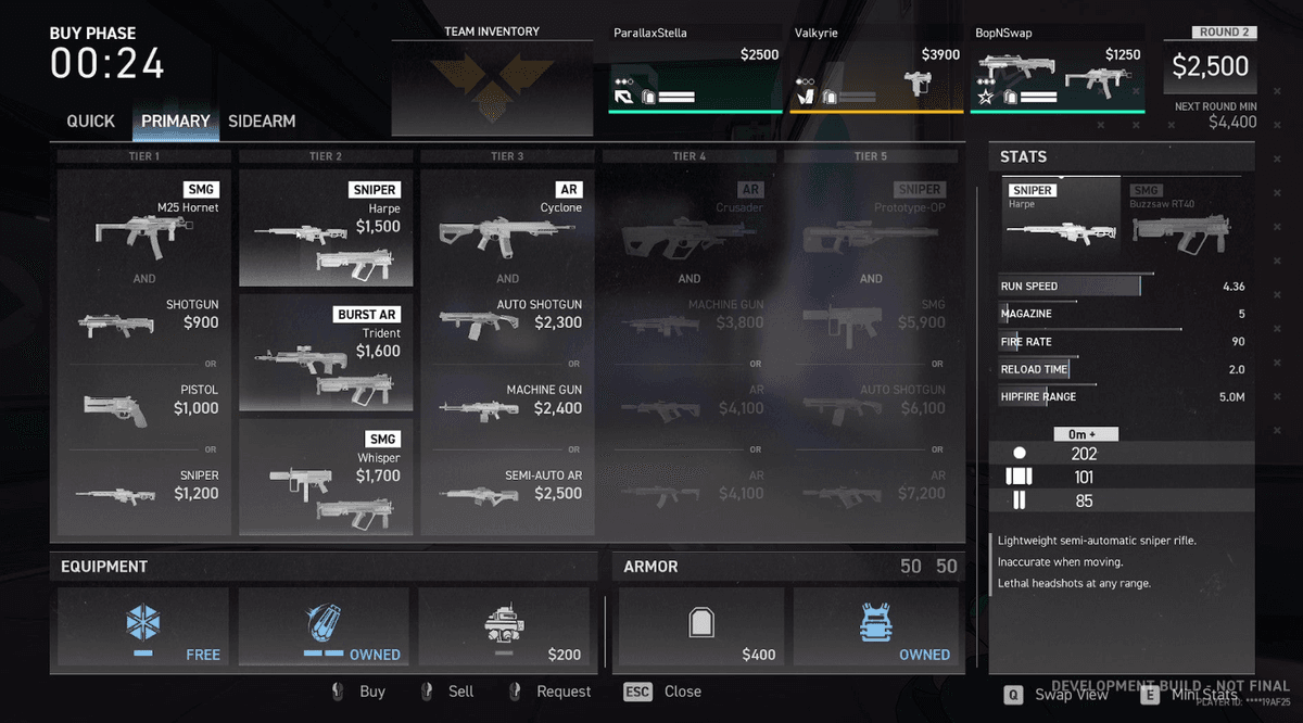 When we look at the game, we notice that it has similar gameplay to both Valorant and Counter Strike in that it's a shooter game that ends with planting a bomb. On the other hand, we see that its buy phase works a little bit differently than the others: In Spectre Divide, you buy weapons as sets. As you control two bodies, you will need two weapons, however, they cannot be the same one. In the game, there are weapon sets. For example, you can have an M25 Hornet and choose between a Shotgun, Pistol, and Sniper and create your own set or buy one of the sets in the store.
