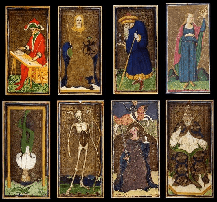 When we look at the history of tarot cards, tarot cards were initially used for playing trick-taking games such as Italian tarrochini, French tarot, and Austrian Königrufen. In the mid-15th century, these tarot decks were mainly used for playing card games, and in the late 18th century, some tarot decks were used for cartomancy, in other words, fortune telling. There are three major tarot decks. One of the earliest tarot decks was called the Visconti-Sforza deck and it was a handmade deck presented to the noble family, more specifically to Filippo Maria Visconti, the Duke of Milan who commissioned this particular deck.