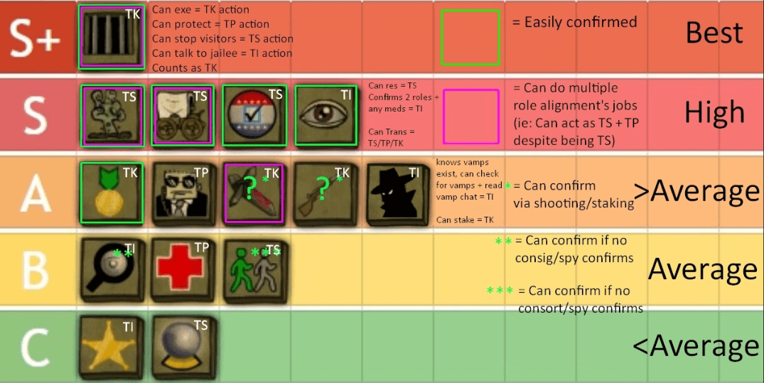 The Town roles are also separated into subcategories. There are Town Investigate, Town Killing, Town Protective, and finally Town Support. Town Investigate consists of Investigator who investigates one person each night for a clue to their role, a Lookout who watches one person at night to see who visits them, a Sheriff who checks one person each night for suspicious activity, Spy who can bug a player's house to see what happens to them that night and the Spy can also know who the Mafia and Coven visit each night. Town Killing on the other hand consists of a Jailor who chooses one person during the day to jail for the night, Vampire Hunter who checks for Vampires each night, a Veteran who can decide to go on alert and can kill anyone who visits, Vigilante who chooses to take justice in their hand and shoots someone. Town Protective consist of a Bodyguard who protects one person from death each night, and a Doctor who heals one person each night and prevents them from dying. Town Support consists of Escort who distracts someone each night, Mayor who can reveal themselves later in the game and can gain 3 votes due to the revelation, a Medium who can speak with the dead players at night, Retributionist who can raise a dead Town member and use their ability on a player, and a Transporter who chooses to transport two people at night.