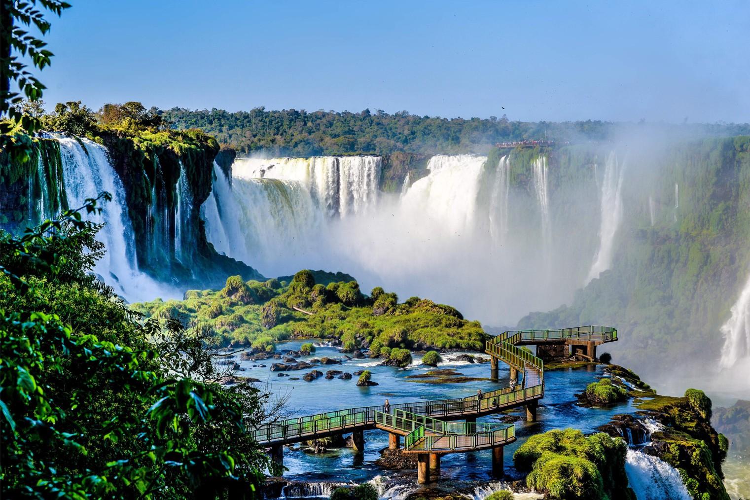 The enormous Iguazú Falls lie along Argentina's border with Brazil, with Iguazu National Park on the Argentinian side and Iguaçu National Park on the Brazilian side. These waterfalls are protected as a UNESCO World Heritage Site and they are one of the most spectacular sights in South America.