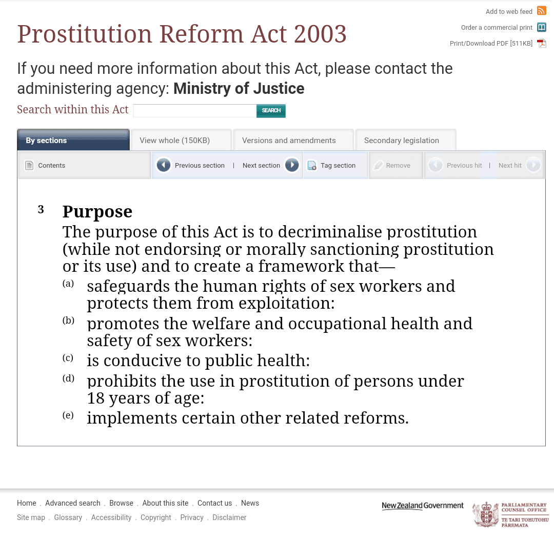 A good example of this is New Zealand's Prostitution Reform Act of 2003. The intent was to decriminalize sex work undertaken by persons over the age of 18 “to safeguard the human rights of sex workers and protect them from exploitation,” as well as to pursue public health goals. The law requires that all efforts be made to ensure the use of condoms in sex work, whether in brothels or otherwise, but infractions of those rules are not criminal offenses. The law explicitly states that sex workers are covered under the government’s 1992 law on health and safety in the workplace. Five years later, a report on how this act affected sex work in the country, the findings are as follows: