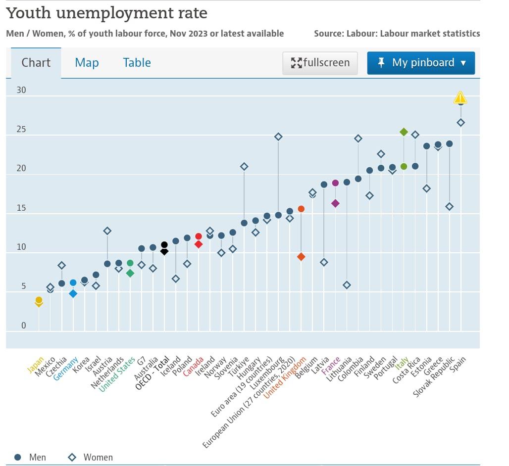 Finding a job right after college is no piece of cake, especially in today’s highly demanding job market. The number of unemployed people aged 15-24 expressed as a percentage of the youth labor force gives us the youth unemployment rate. According to OECD, as of November 2023, the country with the highest youth unemployment rate is Spain, with 29.2% in men, and 26.6% in women while the lowest rate belongs to Japan, with 4% in men, and 3.6% in women. Turkey ranks 20th overall, with the youth unemployment rate for men being 13.8%. However, the country slips to 8th in youth unemployment rate for women which is 21%.