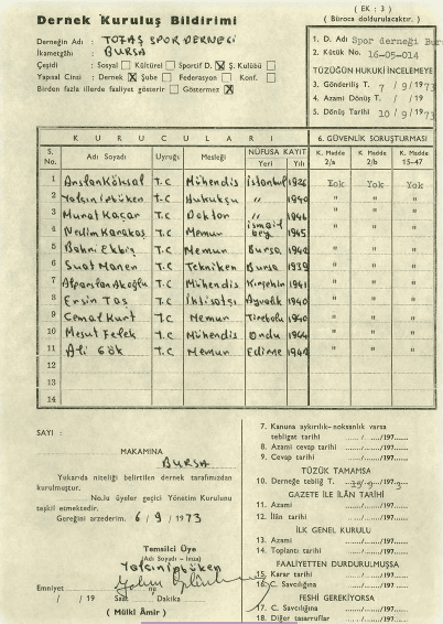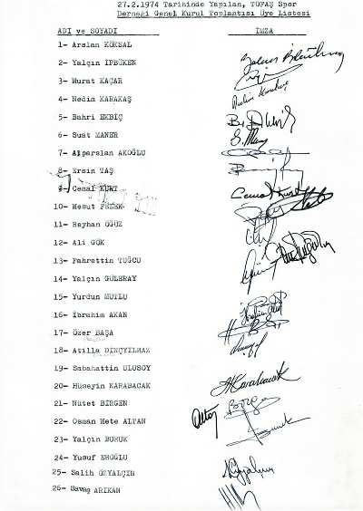 (27.02.1974 TOFAŞ Spor Kulübü'nün ilk genel görünümüne katılan üye listesi)